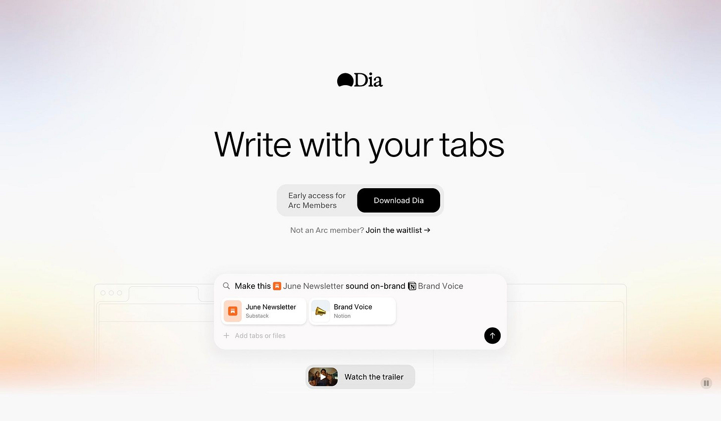 What Dia offers that Arc does not is a way to "chat" with your tabs. It's a chat sidebar with the context of whatever page you're on, plus you can add additional tabs by @mentioning them.